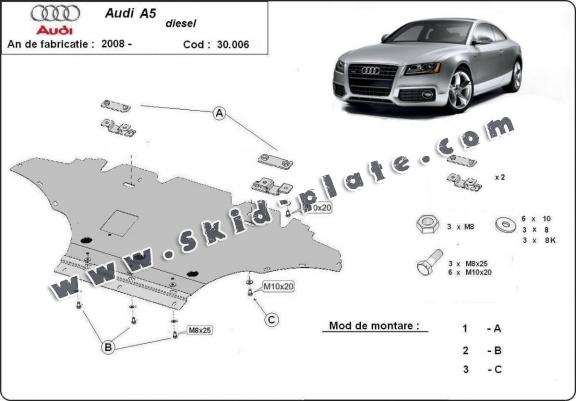 | The skid plate is new and fits perfectly for the Audi A5, with the following engine/drive versions: 2.0TFSI, 2.0Tdi, 2.7, 3.0 V6 quattro - manufactured between 2008 and 2016. |