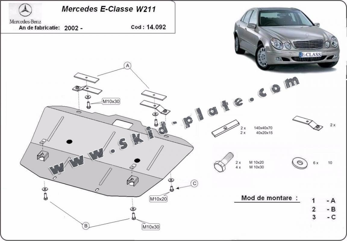 | The skid plate is new and fits perfectly for all versions of Mercedes E-Classe W211 manufactured between 2002 and 2008. |