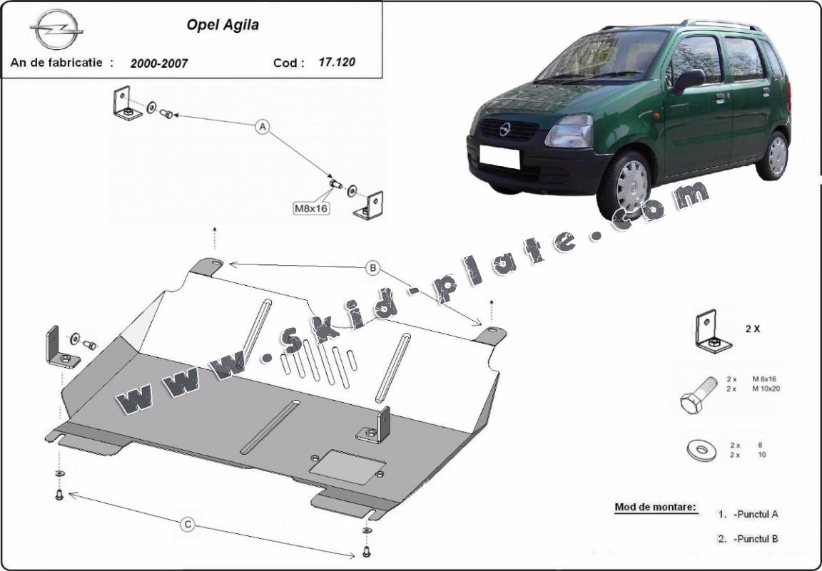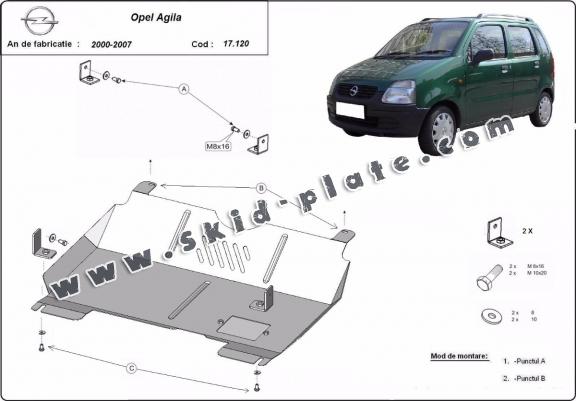 | The skid plate is new and fits perfectly for the Opel Agila (H00), with the following engine/drive versions: 1.0, 1.2, 1.3D - manufactured between 2000 and 2007. |