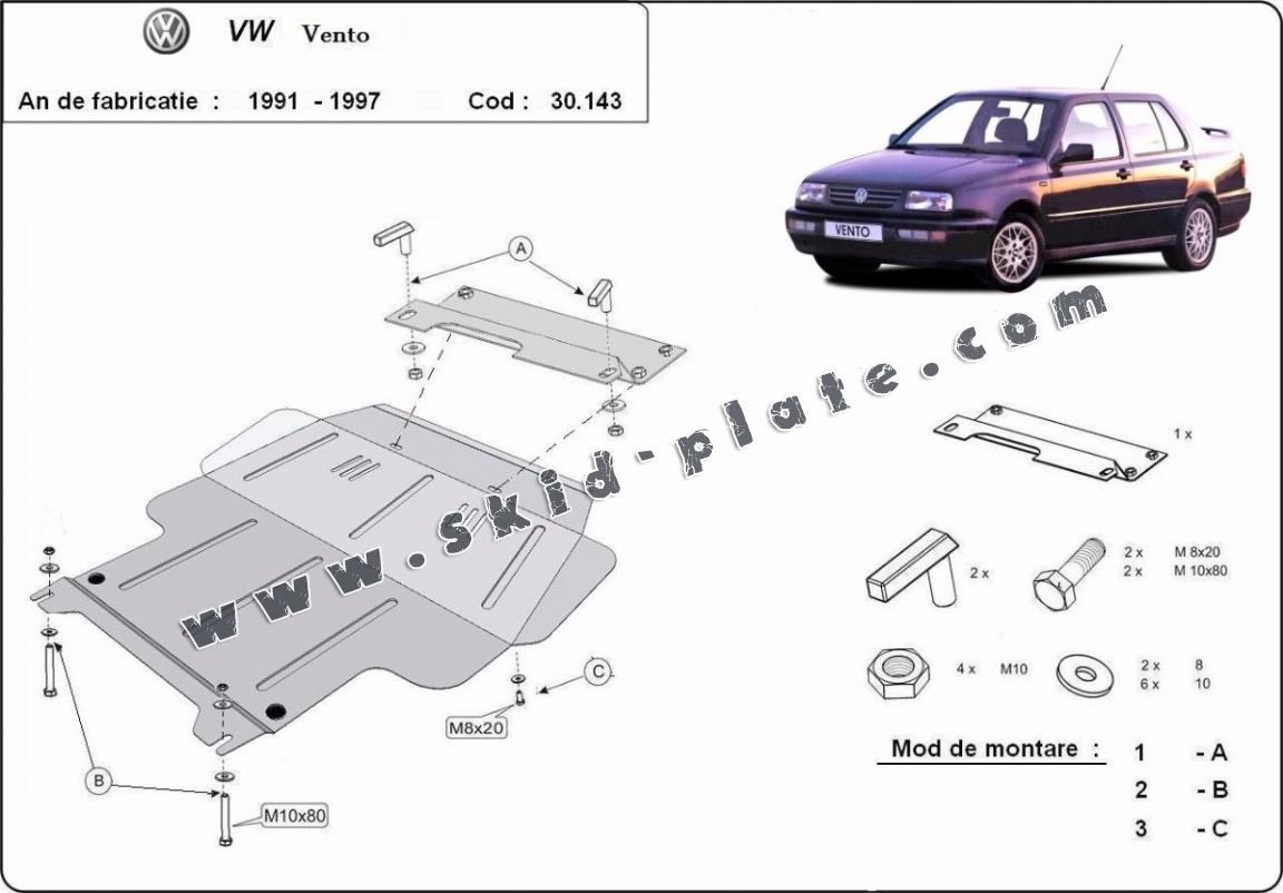 | The skid plate is new and fits perfectly for the Volkswagen Vento, with the following engine/drive versions: 1.4, 1.6, 1.9 D - manufactured between 1991 and 1999. |