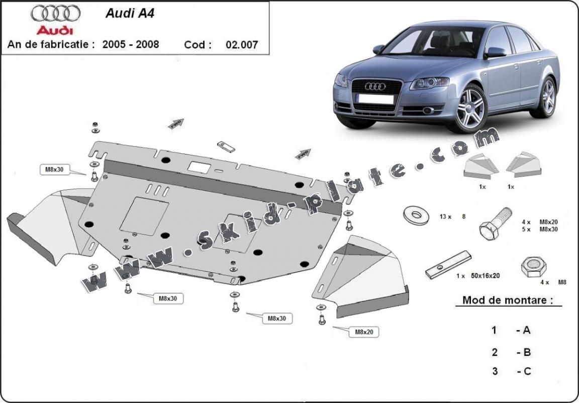 | The skid plate is new and fits perfectly for the Audi A4 B7 All Road , with the following engine/drive versions: 1.6 , 1.8 , 2.0 , 1.9 tdi , 2.0 tdi , 3.0 tdi - manufactured between 2005 and 2008. |