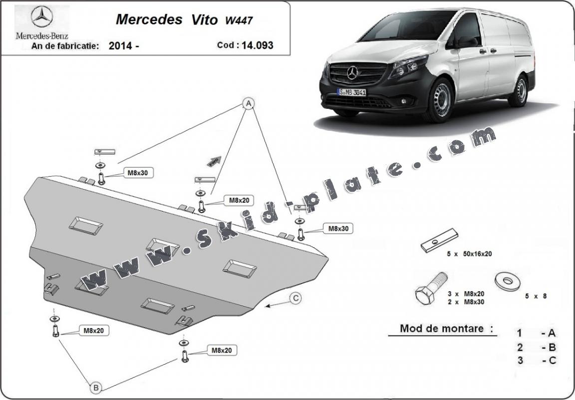 | The skid plate is new and fits perfectly for the Mercedes Vito W447, with the following engine/drive versions: 4x2, 1.6 D - manufactured between 2014 and 2025. |