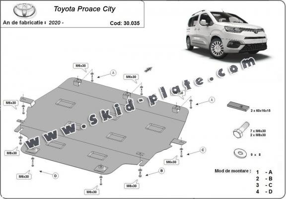 | The skid plate is new and fits perfectly for the Toyota Proace City, with the following engine/drive versions: - manufactured between 2020 and 2025. |