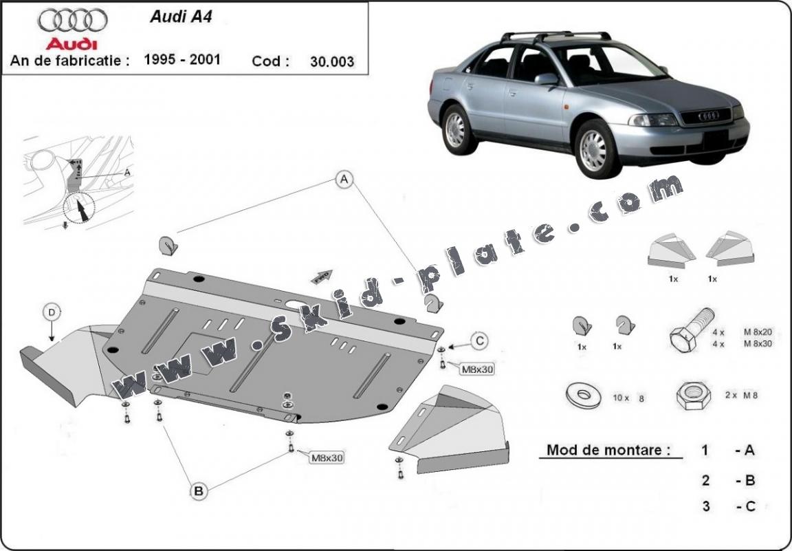 | The skid plate is new and fits perfectly for the Audi A4 B5, with the following engine/drive versions: 1.6- 2.0, 1.9TDI - manufactured between 1995 and 2000. |