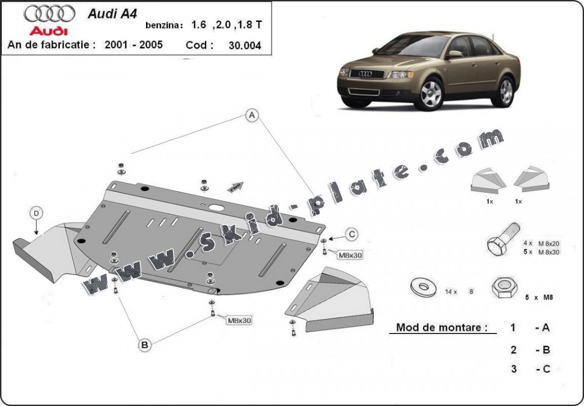 | The skid plate is new and fits perfectly for the Audi A4 B6, with the following engine/drive versions: 1.6 - 2.0 , 1.8T - manufactured between 2000 and 2005. |