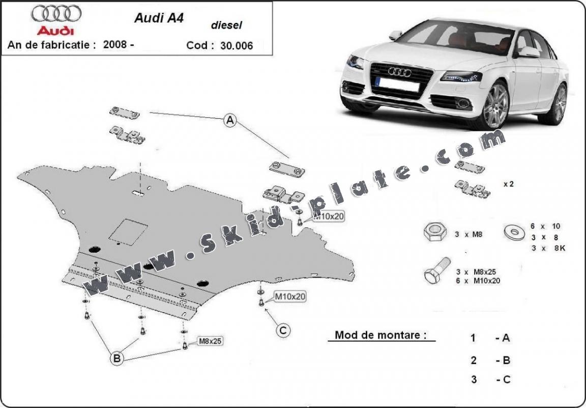 | The skid plate is new and fits perfectly for the Audi A4 B8, with the following engine/drive versions: 2.0TFSI,2.0Tdi, quatro, 2.7TDI - manufactured between 2008 and 2015. |