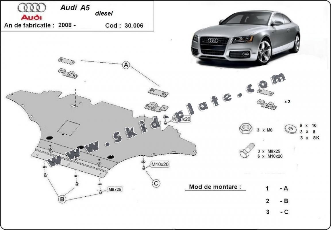 | The skid plate is new and fits perfectly for the Audi A5, with the following engine/drive versions: 2.0TFSI, 2.0Tdi, 2.7, 3.0 V6 quattro - manufactured between 2008 and 2016. |