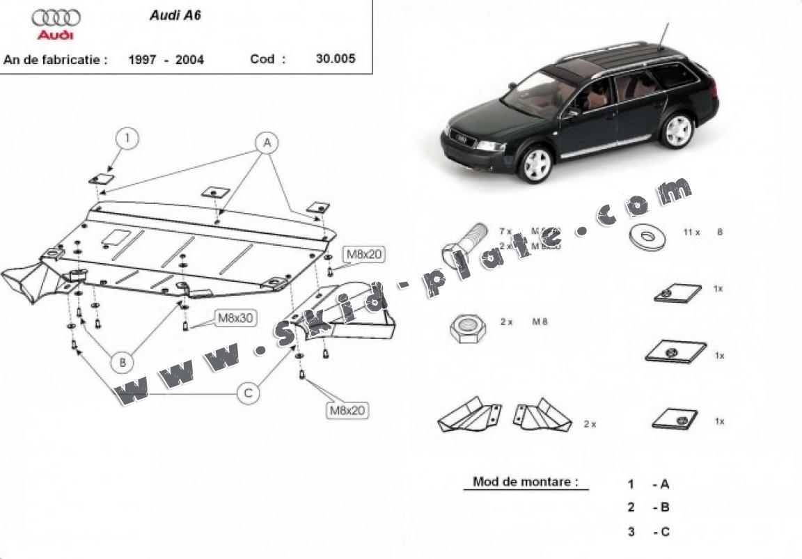 | The skid plate is new and fits perfectly for the Audi A6, with the following engine/drive versions: 1.9 , 2.6 , 2.8 , 2.5 D , 2.4 T - manufactured between 1997 and 2004. |