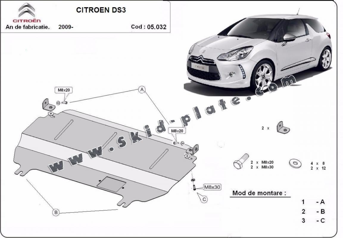 | The skid plate is new and fits perfectly for the Citroen DS3, with the following engine/drive versions: 1.1,1.2, 1.4, 1.6, 1.6 HDI - manufactured between 2009 and 2025. |