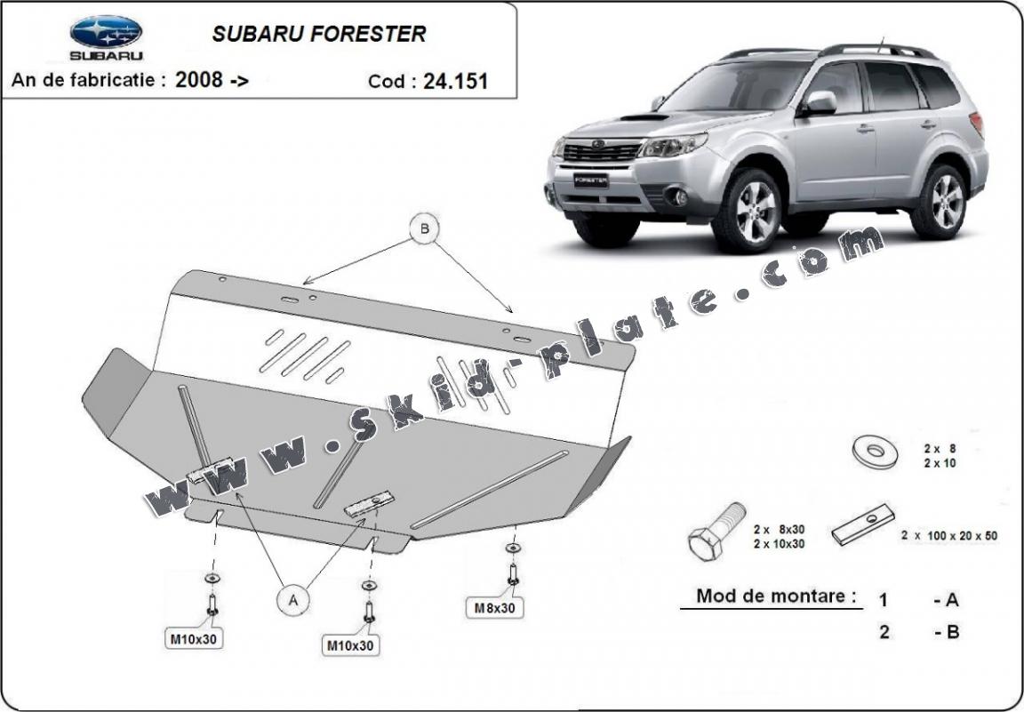 Sump guard for Subaru Forester III. Nice product and fast delivery from Romania to the Netherlands. I had to drill two holes 10 mm into a crossmember of the car to attach the sump guard. Just a little disadvantage.