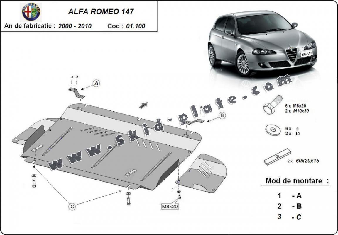 | The skid plate is new and fits perfectly for the Alfa Romeo 147, with the following engine/drive versions: 1,6; 2,0; 3,2; 1,9JTD - manufactured between 2000 and 2010. |