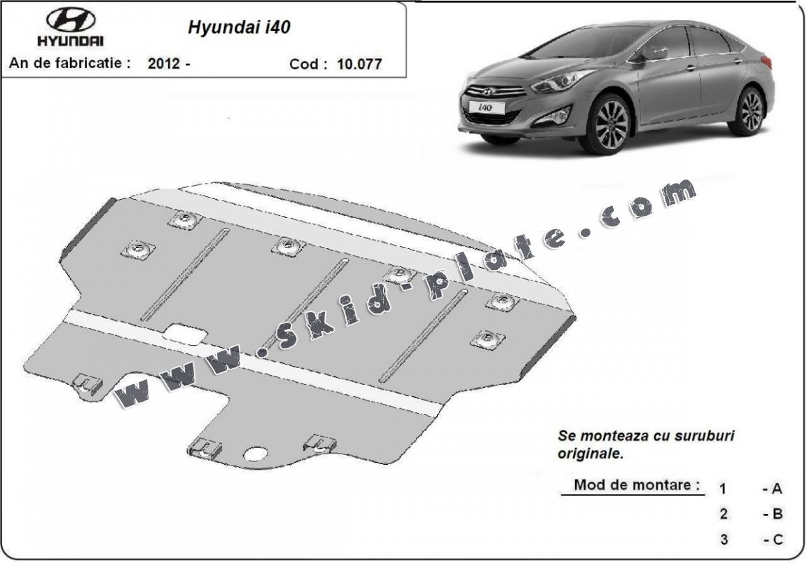 | The skid plate is new and fits perfectly for all versions of Hyundai i40 manufactured between 2011 and 2015. |