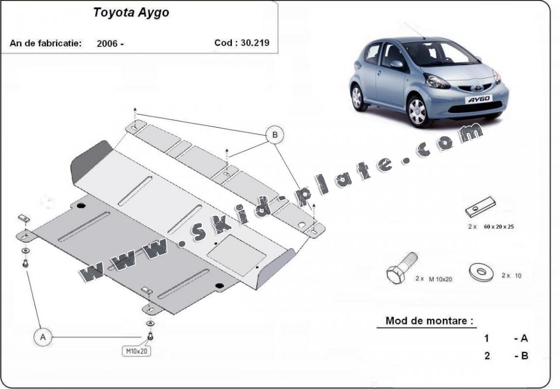 | The skid plate is new and fits perfectly for all versions of Toyota Aygo AB10 manufactured between 2005 and 2014. |