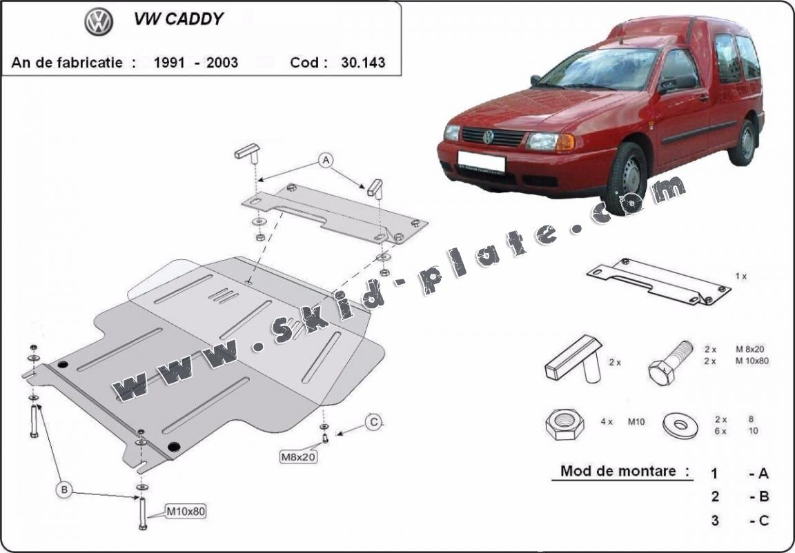 | The skid plate is new and fits perfectly for the Volkswagen Caddy, with the following engine/drive versions: 1.9 TDI, 1.9 SDI - manufactured between 1991 and 2003. |