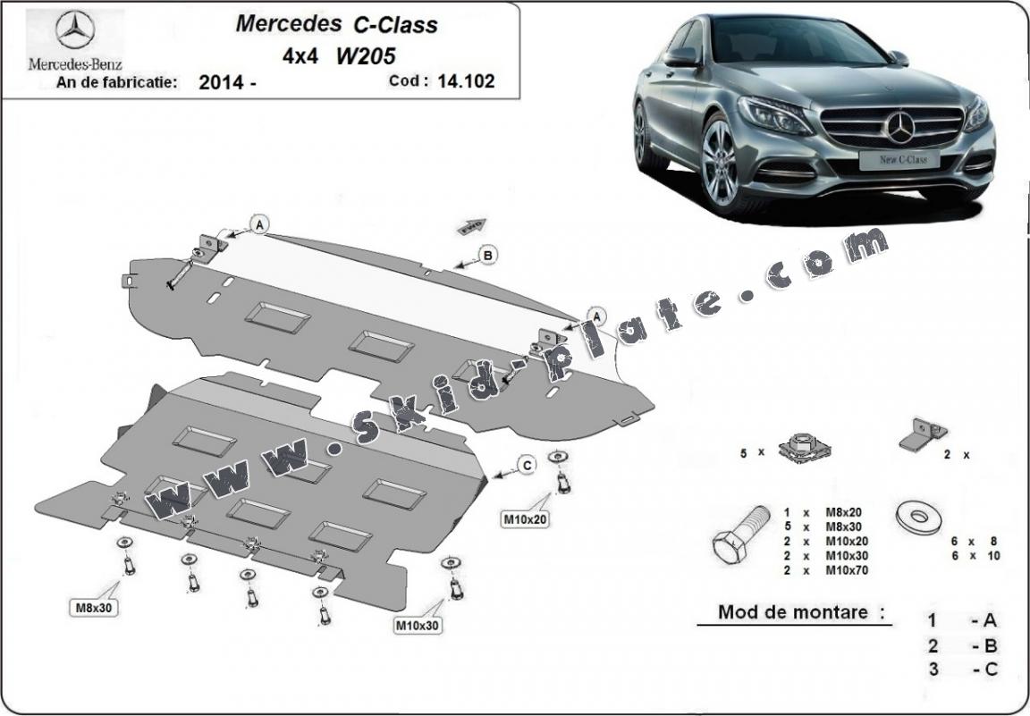 | The skid plate is new and fits perfectly for the Mercedes C-Class W205 4x4, with the following engine/drive versions: 4x4 - manufactured between 2014 and 2021. |