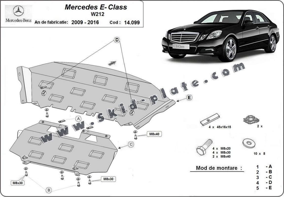 | The skid plate is new and fits perfectly for the Mercedes E-Classe W212, with the following engine/drive versions: Only 4x2 - manufactured between 2009 and 2016. |