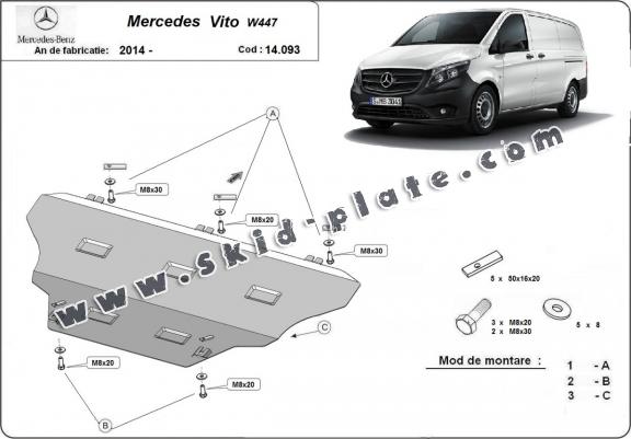 | The skid plate is new and fits perfectly for the Mercedes Vito W447, with the following engine/drive versions: 4x2, 1.6 D - manufactured between 2014 and 2025. |